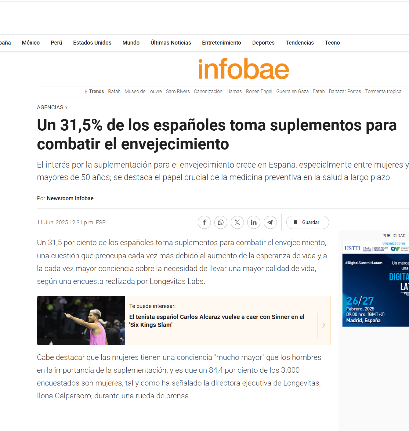 Artículo en inglés publicado en Vogue hace un par de semanas sobre el abordaje del envejecimiento como enfermedad. Nombres y términos tratados en mi libro; ejercicio, dieta mediterránea, Blue Zones, ayuno intermitente, metformina, sueño, secuenciación del genoma, Barzilai, Sinclair…